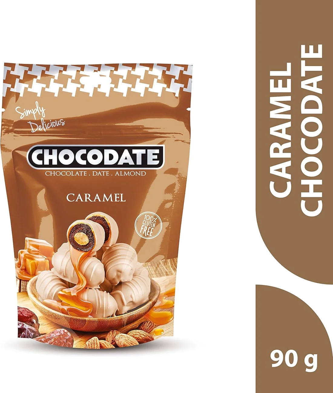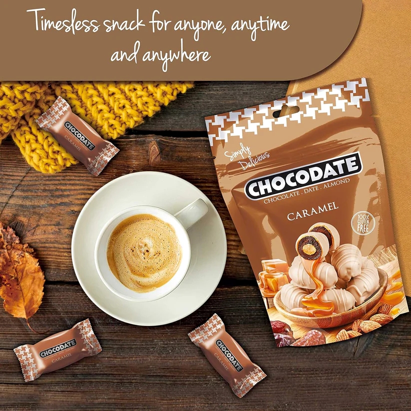 Chocodate Caramel Chocolate with Date and Almond is a delicious treat that combines the sweetness of dates, the crunch of almonds and the softness of caramel chocolate. This 90g pack is perfect for enjoying a rich and satisfying snack.