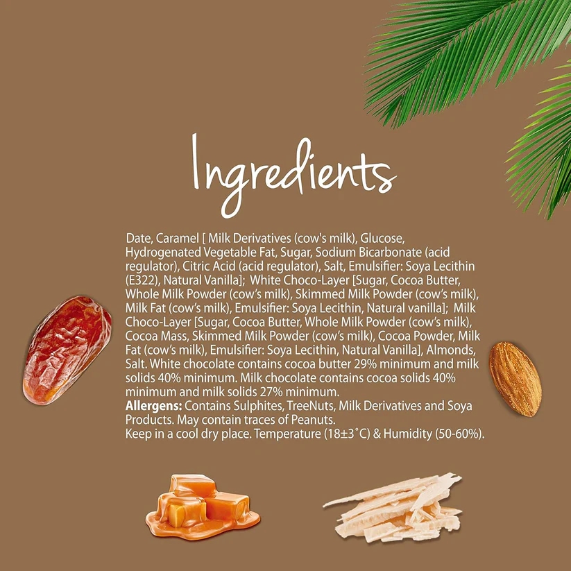 Product specifications: The elegant caramel almond date treats are available in a 90 g snack pack and should be stored in a cool, dark place.
