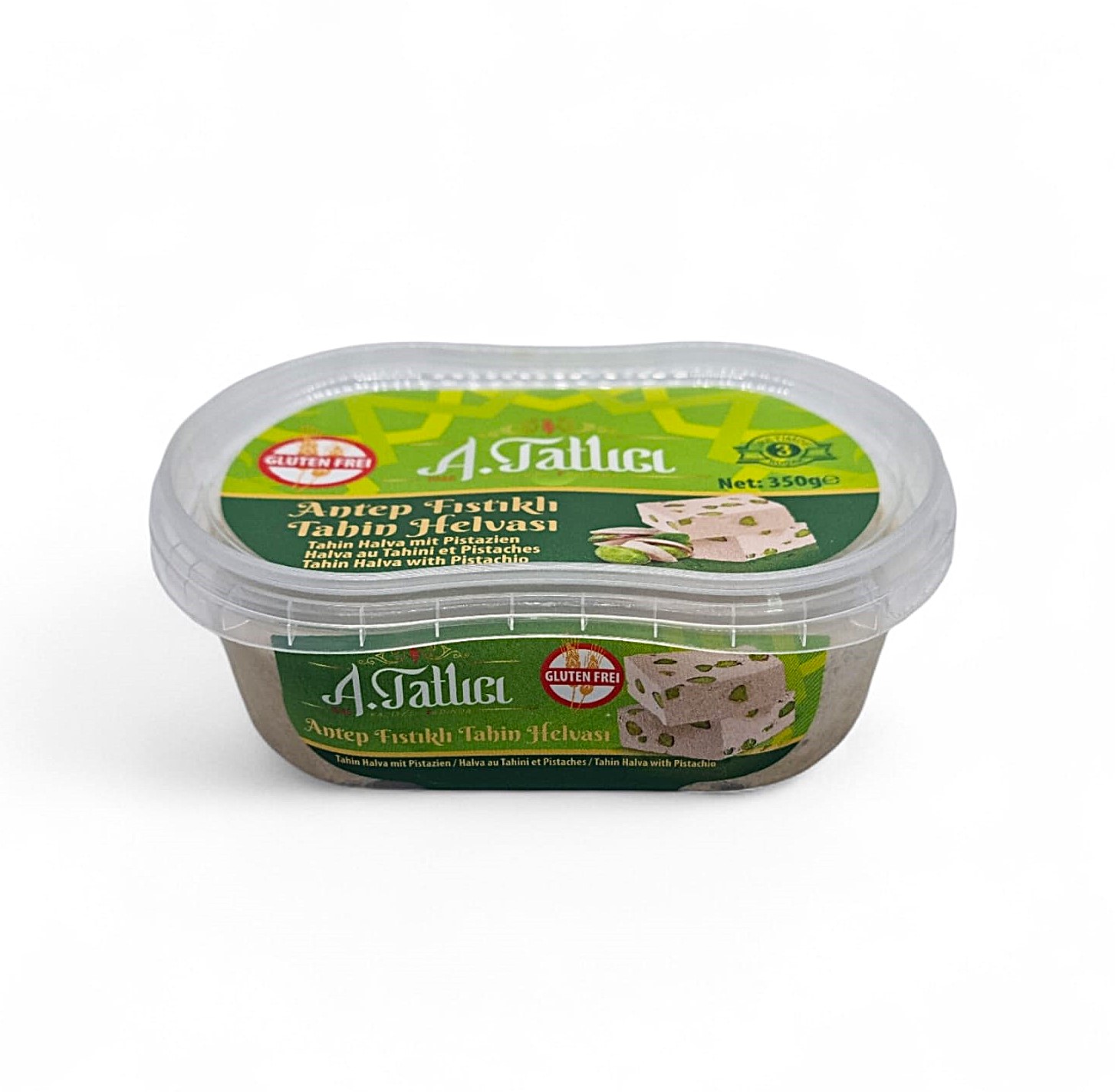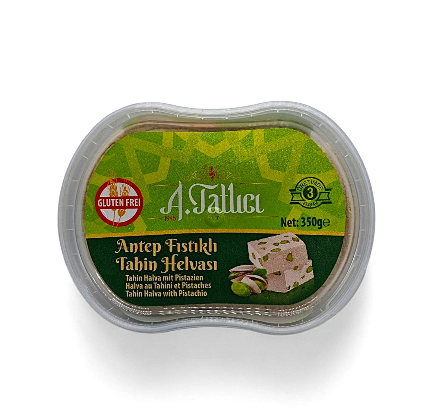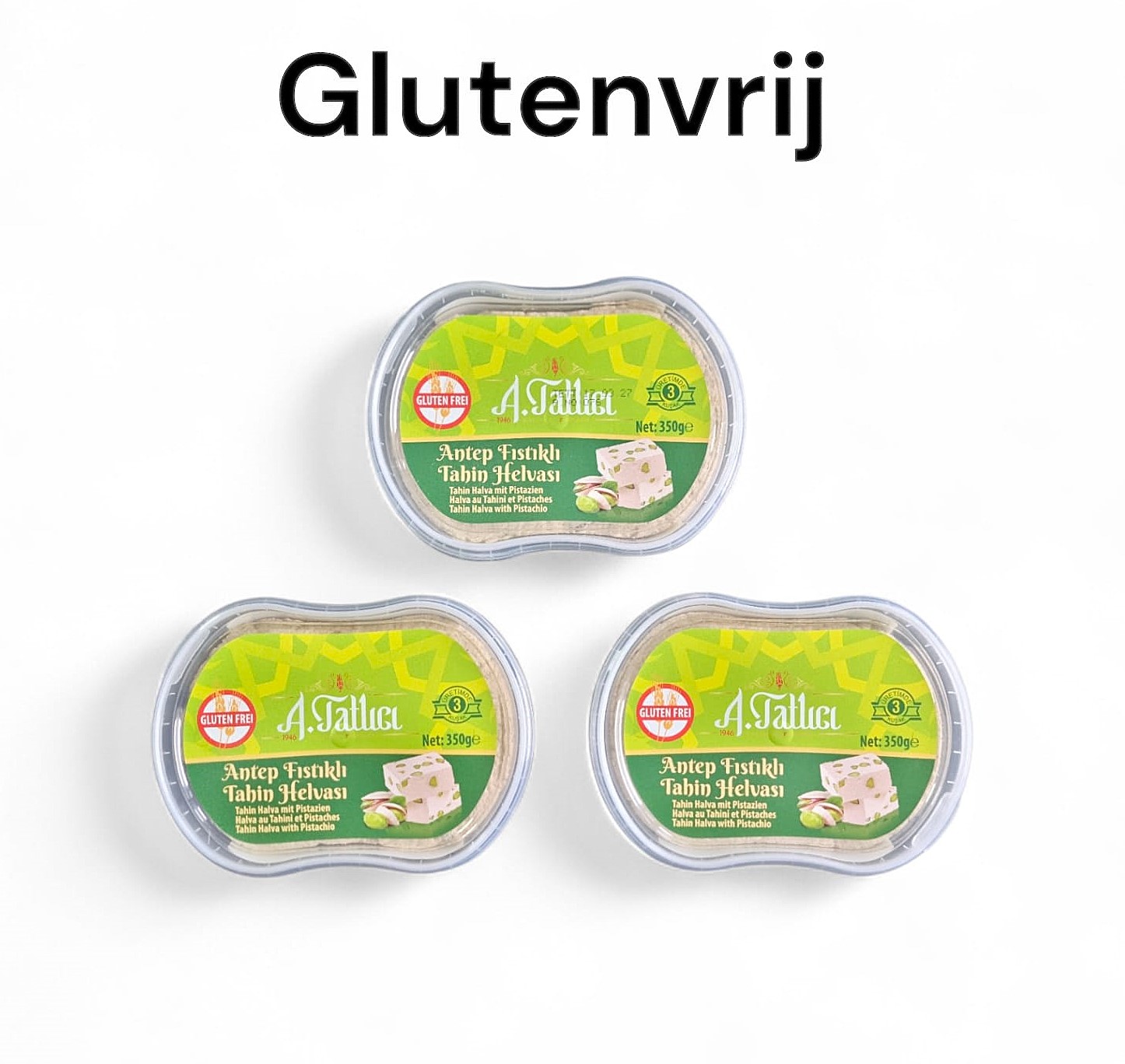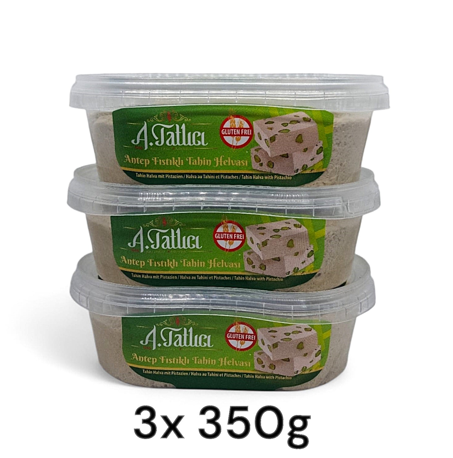 Abdurrahman Tatlıcı Glutenvrije Pistache Tahin Helva 3x350g – traditionele Turkse sesamhalva met echte Antep pistachenoten. Rijk aan eiwitten, vezels en natuurlijke energie. Zonder gluten of kunstmatige toevoegingen. Een perfecte gezonde traktatie of dessert! 🥜🌿
