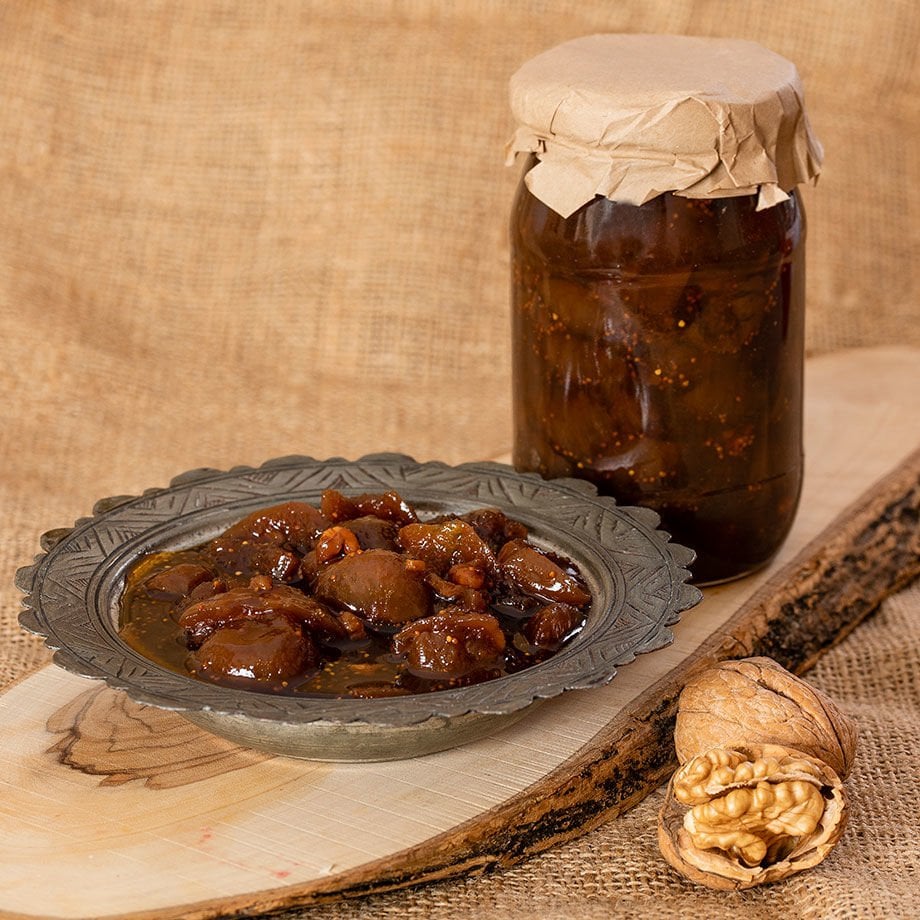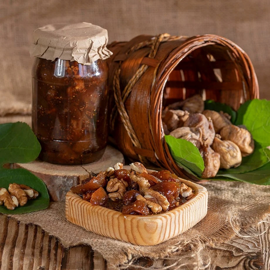 Deze jam, bereid door een mix van 65% Aydin-vijgen en 10% walnoten, is gemaakt van zorgvuldig geselecteerd fruit en geproduceerd volgens traditionele methoden zonder toevoegingen. Het geeft uw tafels een natuurlijke smaak.
