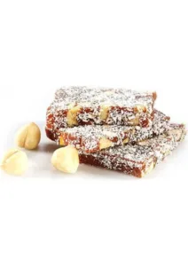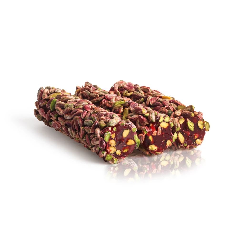 Ingrediënten: suiker, maïszetmeel, water, pistachenoten (15%), aroma (granaatappel), zuurteregelaar (citroenzuur E330), kleurstof voor levensmiddelen (E124).