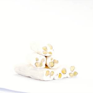 Met de zoetzure frisheid van granaatappel, het unieke aroma van pistachenoten en de delicate toets van rozenblaadjes is deze verrukking niet zomaar een dessert; het is een kunstwerk. Terwijl de verfijnde textuur langzaam in je mond smelt, omhult de geur van rozen je, gevolgd door de levendigheid van de granaatappel en de rijkdom van de pistachenoten die resoneren in de mond. De lange, slanke vingervorm zorgt voor zowel elegantie in presentatie als gemak bij het eten.